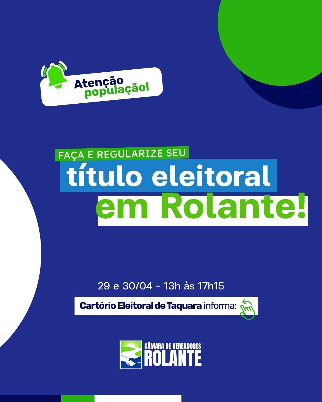 Informamos que o Cartório Eleitoral de Taquara, vai atender na Câmara de Vereadores de Rolante, nos dias 29 e 30 de abril, das 13h às 17:15min.