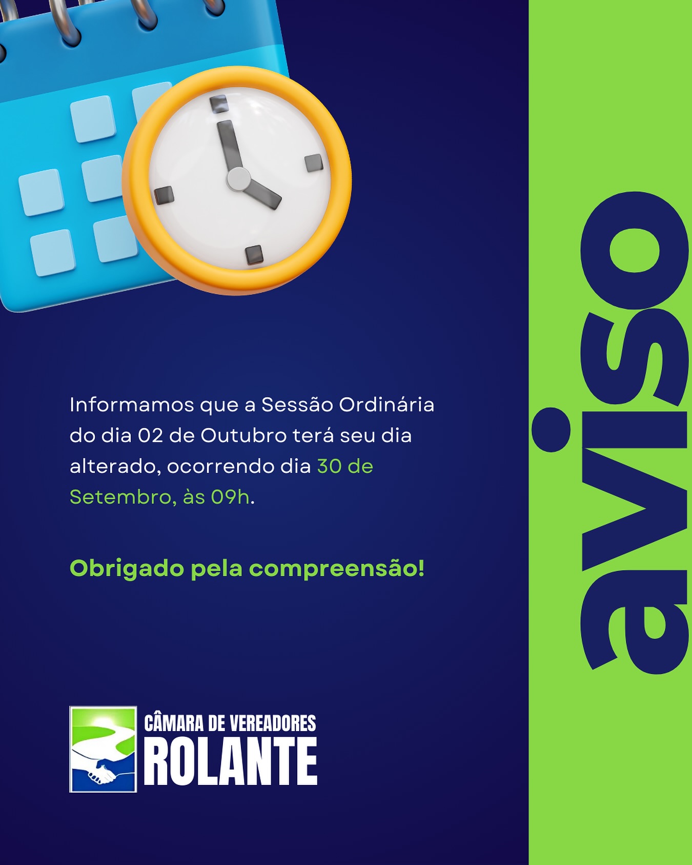 Nossa Sessão Ordinária do dia 02 de Outubro foi alterada para o dia 30 de Setembro!