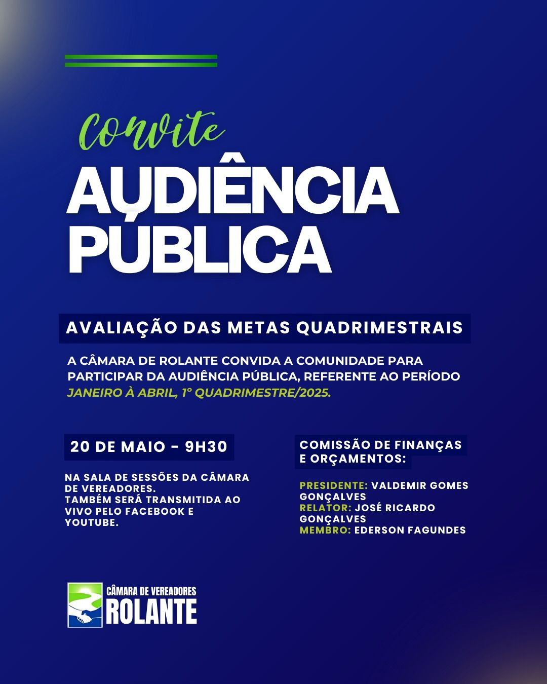 A Comissão de Finanças e Orçamentos convida a comunidade para participar da Audiência Pública para apresentação das Metas Quadrimestrais do 1° Quadrimestre de 2025, que será realizada na terça-feira, dia 20 de maio do corrente ano, às 9h30min., na Sala de Sessões da Câmara de Vereadores de Rolante.