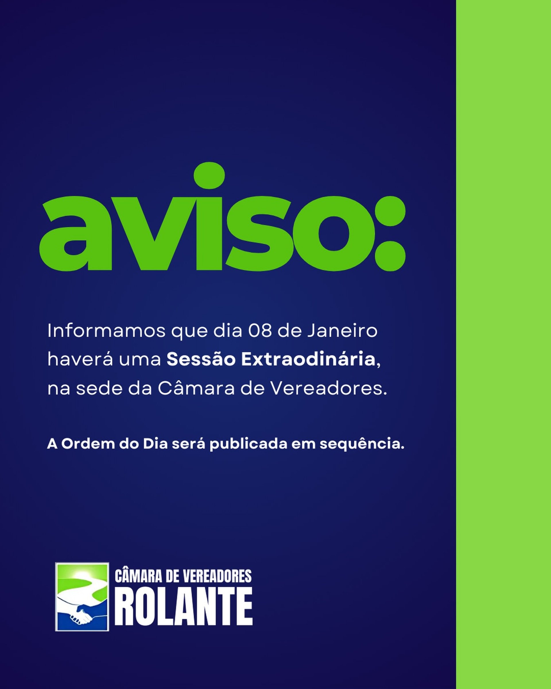 Informamos que haverá uma Sessão Extraordinária nesta quinta-feira, dia 08 de janeiro de 2026, às 19h., na Sala de Sessões.