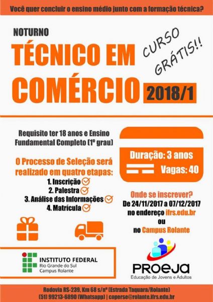 Confira o curso ofertado: Campus Rolante (Rodovia RS-239, Km 68 s/nº, Estrada Taquara/Rolante) - Curso Técnico em Comércio Integrado à Modalidade de Educação de Jovens e Adultos: 40 vagas, turno noite, duração de três anos.
