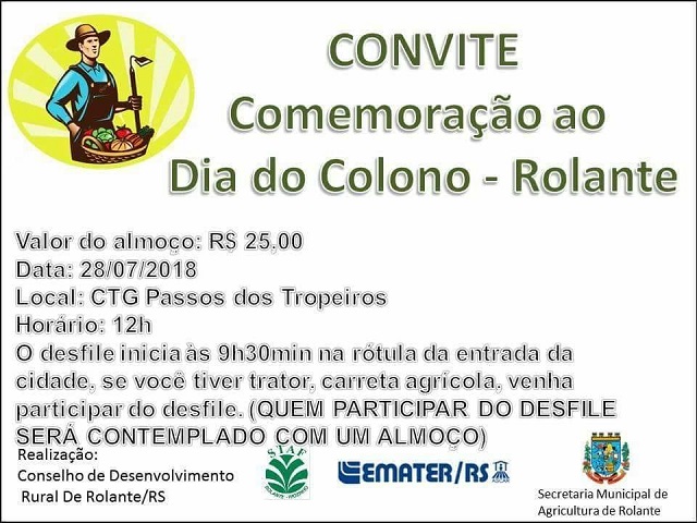A Câmara de Vereadores de Rolante convida toda comunidade para participar ao Desfile em comemoração ao Dia do Agricultor, que ocorrerá no próximo sábado, dia 28.