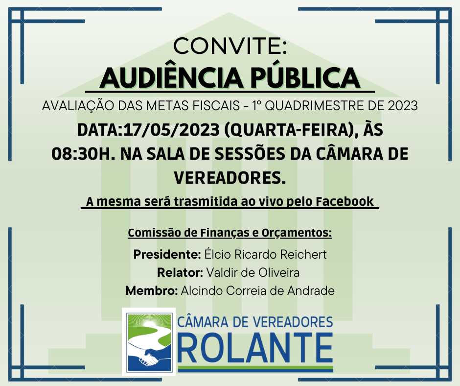 A Comissão de Finanças de Orçamentos convida a comunidade para participar da Audiência Pública para apresentação das Metas Fiscais do 1° Quadrimestre de 2023, que será realizada na quarta-feira, dia 17 de maio do corrente ano, às 08h30min., na Sala de Sessões da Câmara de Vereadores de Rolante.