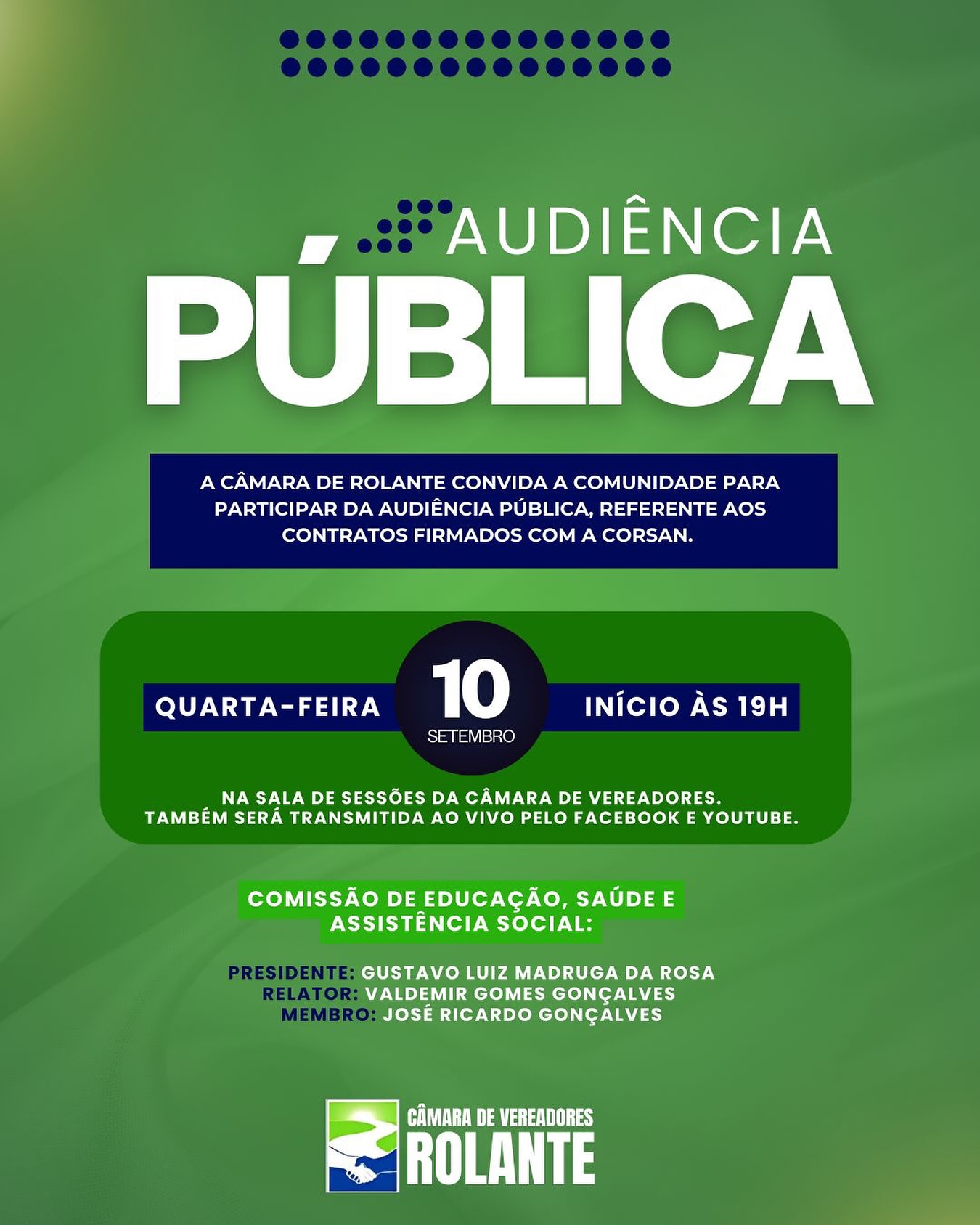 A Comissão de Educação, Saúde e Assistência Social da Câmara de Vereadores de Rolante, convida a comunidade para participar da Audiência Pública, que será realizada no dia 10 de setembro do corrente ano, às 19h00min., na Sala de Sessões que irá tratar sobre os contratos firmados com a CORSAN.
