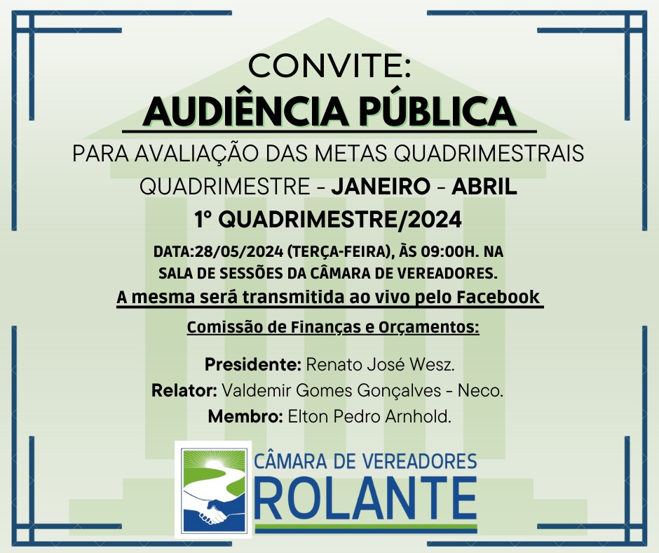A Comissão de Finanças e Orçamentos convida a comunidade para participar da Audiência Pública para apresentação das Metas Fiscais do 1° Quadrimestre de 2024, que será realizada na terça-feira, dia 28 de maio do corrente ano, às 09h00min., na Sala de Sessões da Câmara de Vereadores de Rolante.