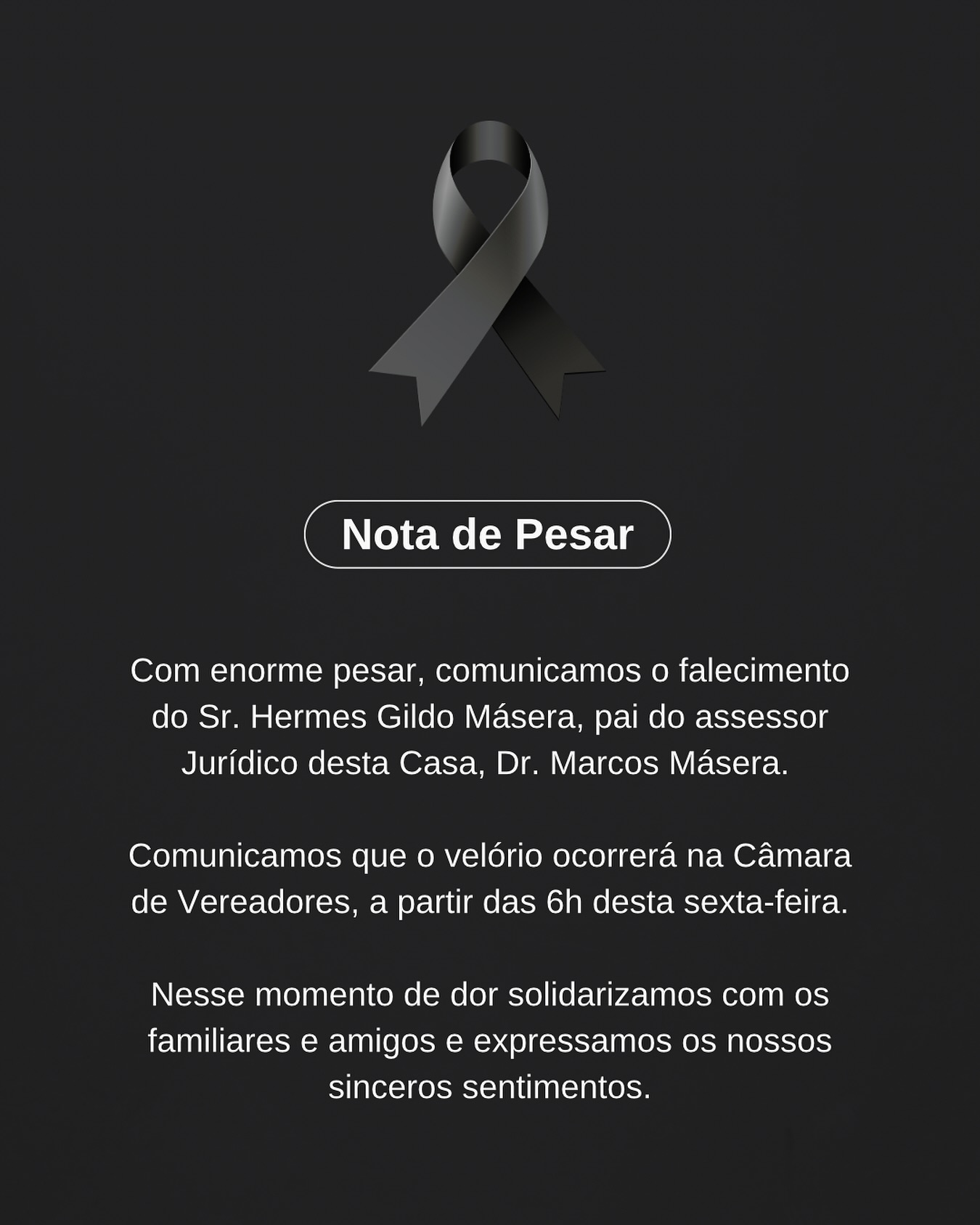 A Câmara de Vereadores de Rolante manifesta profundo pesar pelo falecimento do Senhor Hermes Gildo Másera, pai do assessor jurídico desta Casa, Dr. Marcos Alexandre Másera.