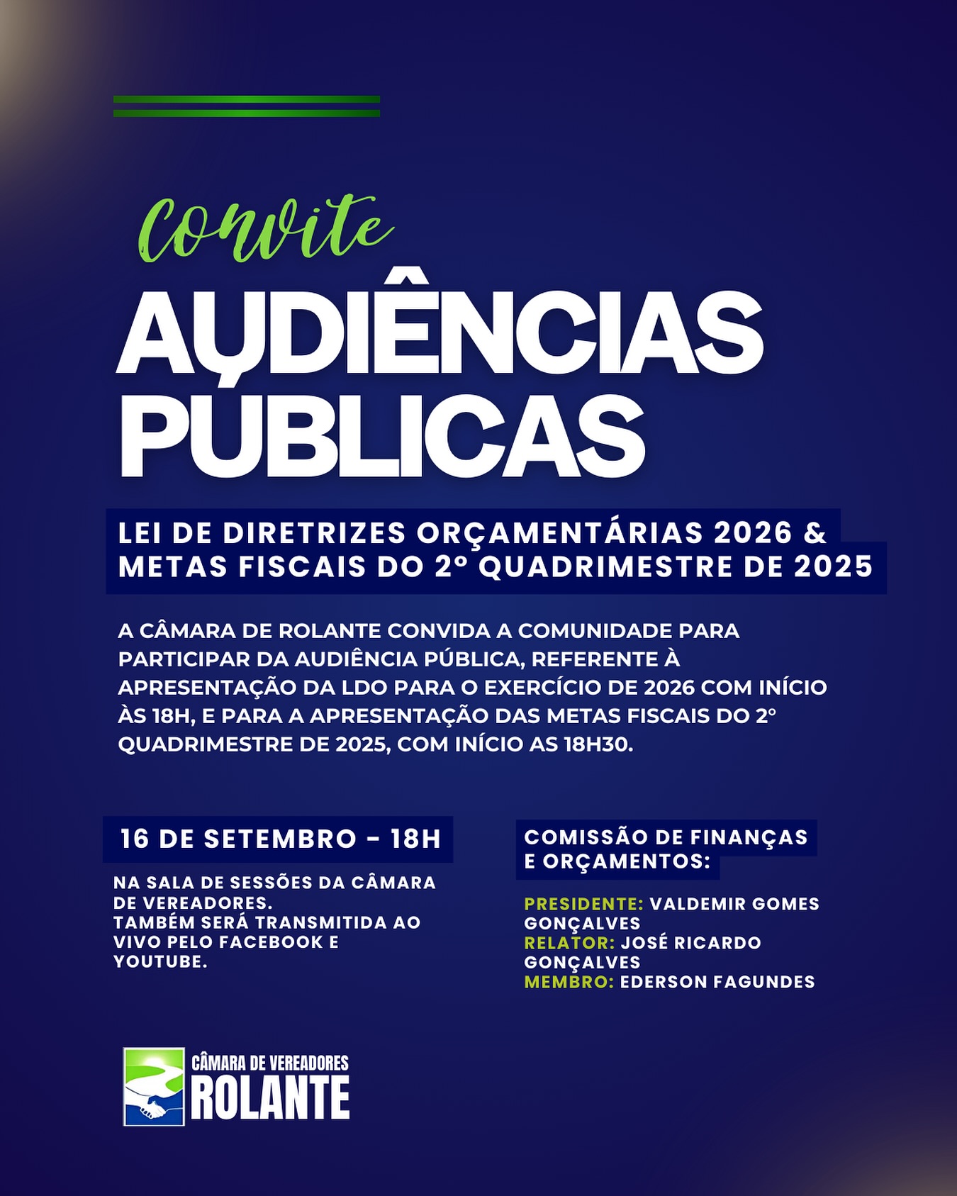 • Convite Audiência Pública: A Primeira para apresentação da Lei de Diretrizes Orçamentárias (LDO) para o exercício de 2026 e a Segunda para apresentação das Metas Fiscais do 2° Quadrimestre de 2025. Ambas serão realizadas na Sala de Sessões da Câmara de Vereadores de Rolante.